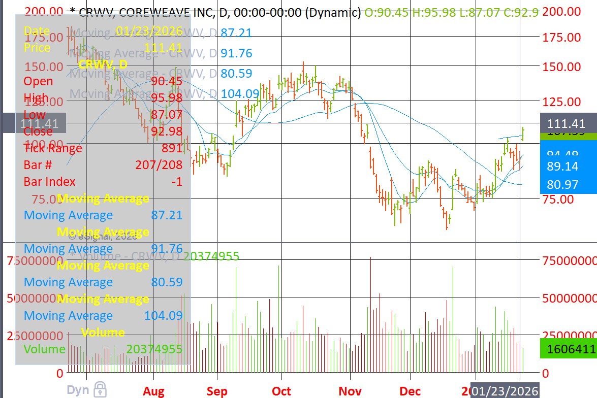 CRWV is having a buyable gap up that just cleared its 200-dma. This comes after the pocket pivot review report we send members on Jan 12.