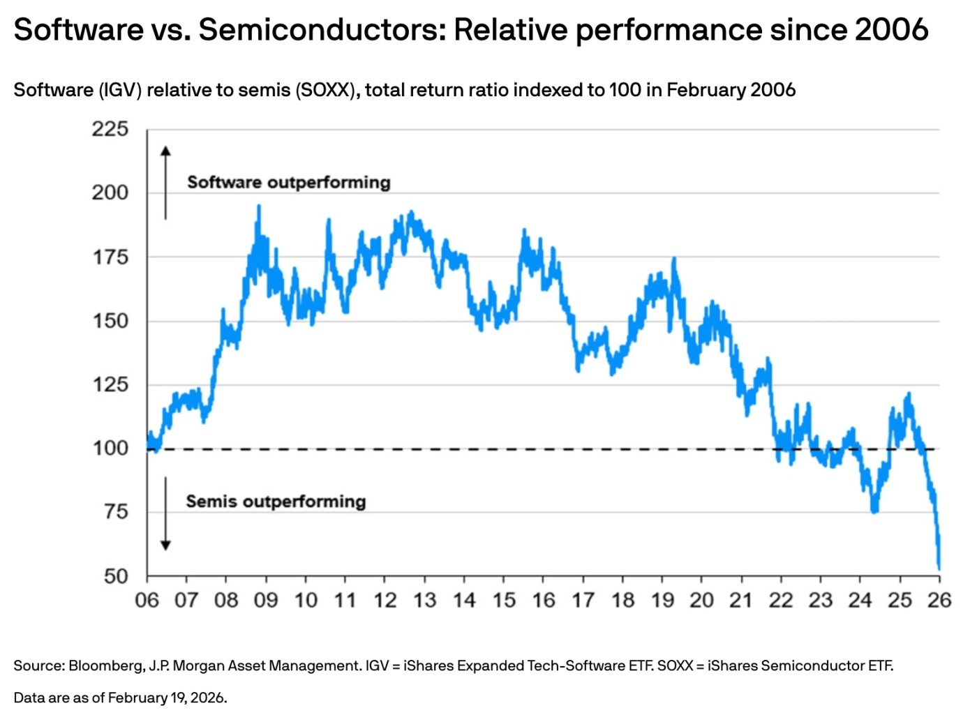 The relative price performance of software versus semiconductors has plunged to multi-decade lows. The AI trade is pivoting hard—from code to hardware.