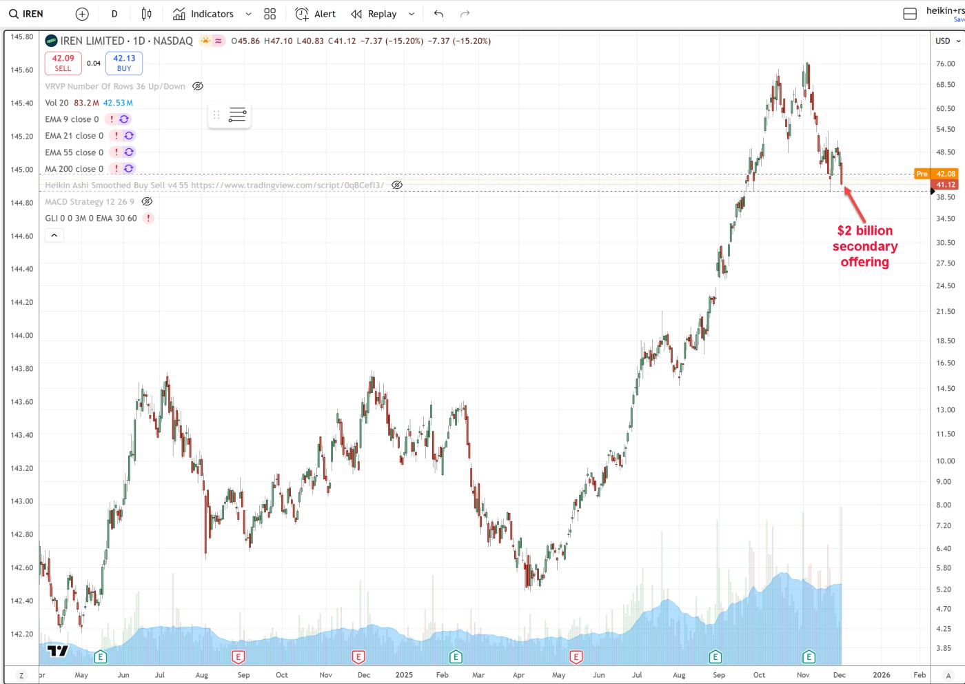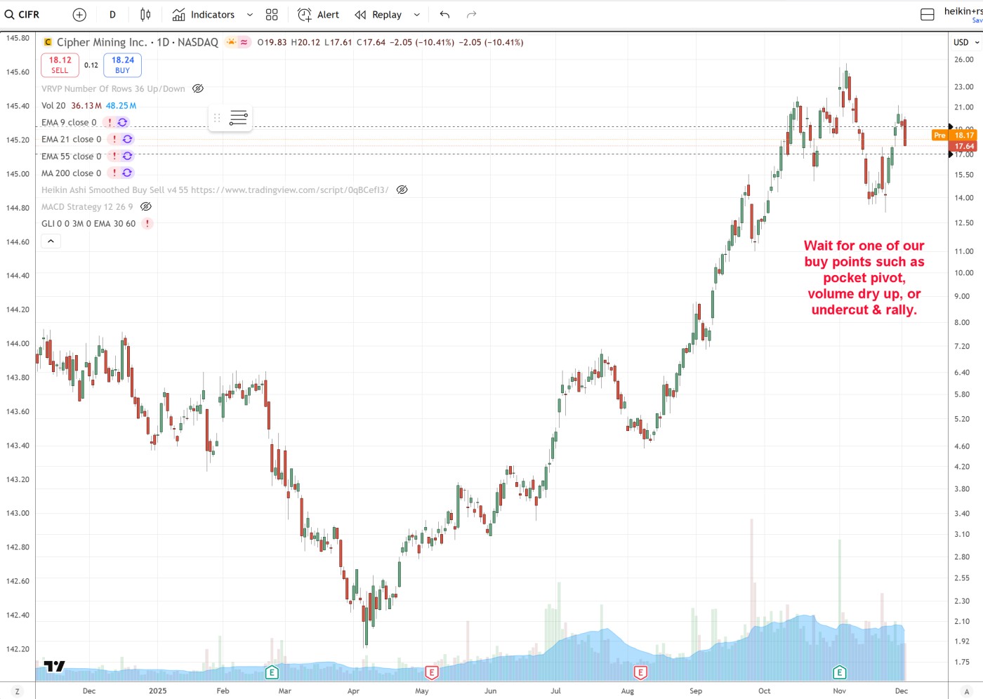 IREN – IREN Limited and CIFR – Cipher Mining (HPC/AI + BTC miners) – large multi‑baggers off 2024 lows as they pivot into AI/HPC capacity alongside mining; performance has been volatile but strongly positive YTD on Nvidia‑driven AI spend.cryptorank+2 Note, IREN did a $2 billion secondary offering on Dec 2 thus its big volume down day. This enables it to scale so is likely a potential entry point but wait first for technical confirmation by way of our buying strategies such as pocket pivot, volume dry up, or undercut & rally.