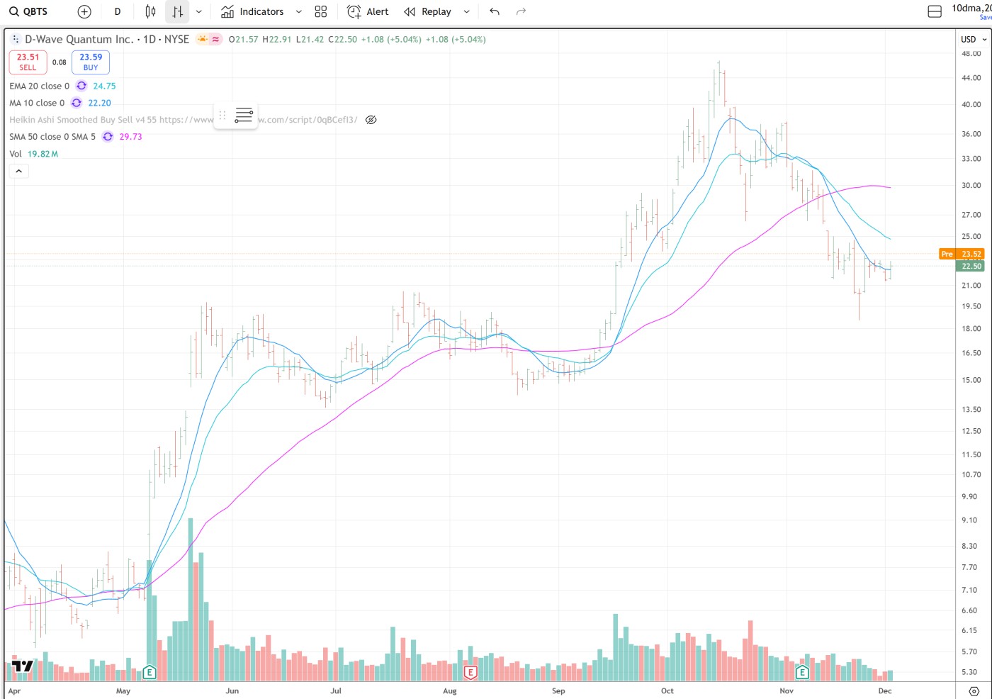 If you’re allocating between them, AI data‑center names currently offer stronger fundamental momentum and somewhat saner volatility, while quantum names are higher‑beta lottery tickets. Strongest of the group is QBTS but it may have topped for good. That said, predictions are always subject to change since price/volume will tell all as the chart unfolds: