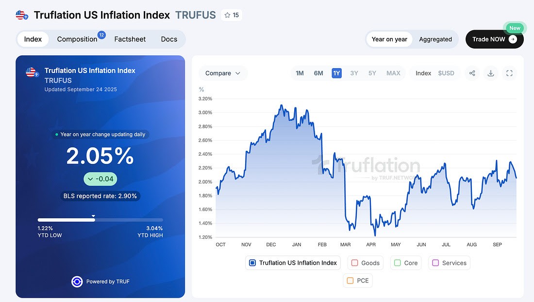 So Powell is saying the previous consensus on tariffs was wrong. In fact, Truflation shows that inflation has dropped from over 3% at the start of the year to only 2.05%. Keep in mind its inflation statistics are based on the rate of change in a broad basket of goods and services, weighted by consumer spending patterns, not just a few categories. Truflation’s drop from 3% to 2.05% means that the overall rate of price increases has slowed in the full basket of tracked goods and services. Sectors outside of food and energy, especially housing-related components, have experienced flat or falling prices, bringing down the “core” inflation rate, which accounts for a large share of total inflation.