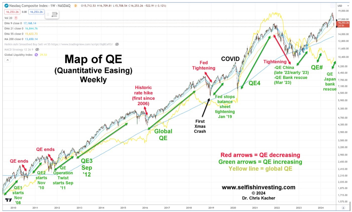 Before launching into the debate, we must acknowledge that major stocks and bitcoin correlate strongly with global liquidity. The reason the dot-com bubble burst in the year 2000 was because the Fed slowed easy money since fears of the Y2K debacle turned out to be a tiny trickle, a non-event. With tighter money and grossly overvalued dot-coms with little to no revenues and defective business models, the bubble burst. So the AI bubble is likely to continue to grow as long as global liquidity continues at its overall pace.As you can see, the NASDAQ Composite correlates strongly with QE: