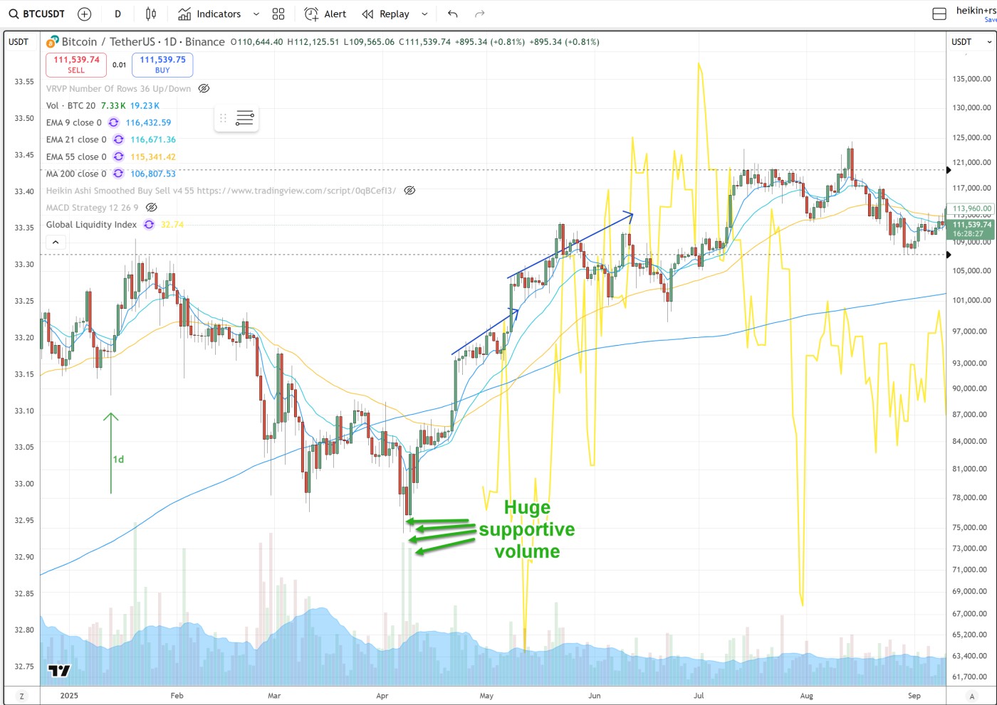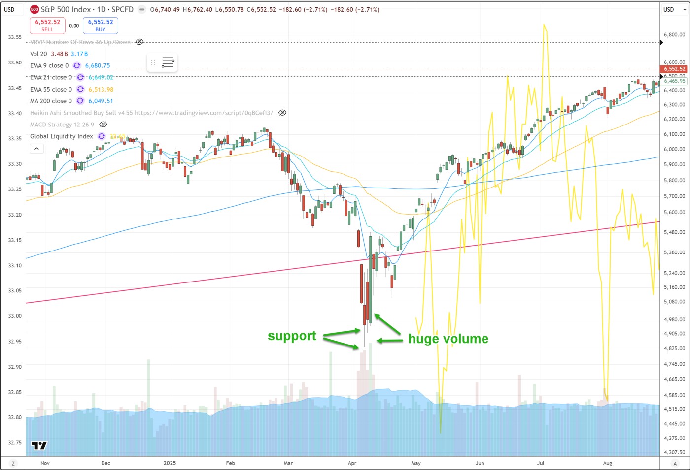 This lines up with global liquidity which continues to pump. So smart money could see this as a buying opportunity, creating a sharp V-bottom, much as we saw in April.Keep a close eye on price/volume action in bitcoin, leading stocks, and major indices the coming days which will determine position sizes in either direction or flat out cash for those who prefer to wait until the dust settles. But dont wait too long. Back in April, huge buying volume defined the major low across markets creating a V-shaped recovery.