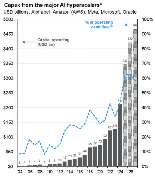 In consequence, the cashflow of leading tech companies that remains mindbogglingly massive is being spent on such infrastructure (capex) because they can afford to do so, yet their spending is still only around 50-60% of their free cashflow.