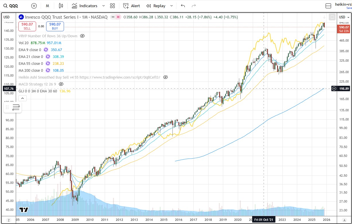ChatGPT alone has more than 10% of the world's population using the platform. Meanwhile, AI allows companies to do more with less so job cuts will continue. At the same time, new jobs are being created at an even faster pace due to AI. AI is already outperforming humans in most tasks including senior-level professionals. AI will power humanoid robots, autonomous vehicles, drones, and countless other machines that will reshape our world. Massive sums are being invested into these areas. Change is becoming hyperexponential. Over the decades, companies that embraced new technologies did well. AI is the largest tsunami yet. A log plot of QQQ underscores this trend. The straight line shows growth is exponential. Global liquidity correlates highly with QQQ. Whenever its rate slows, so do both stock and bitcoin markets at least on a quarterly timeframe if not sooner.