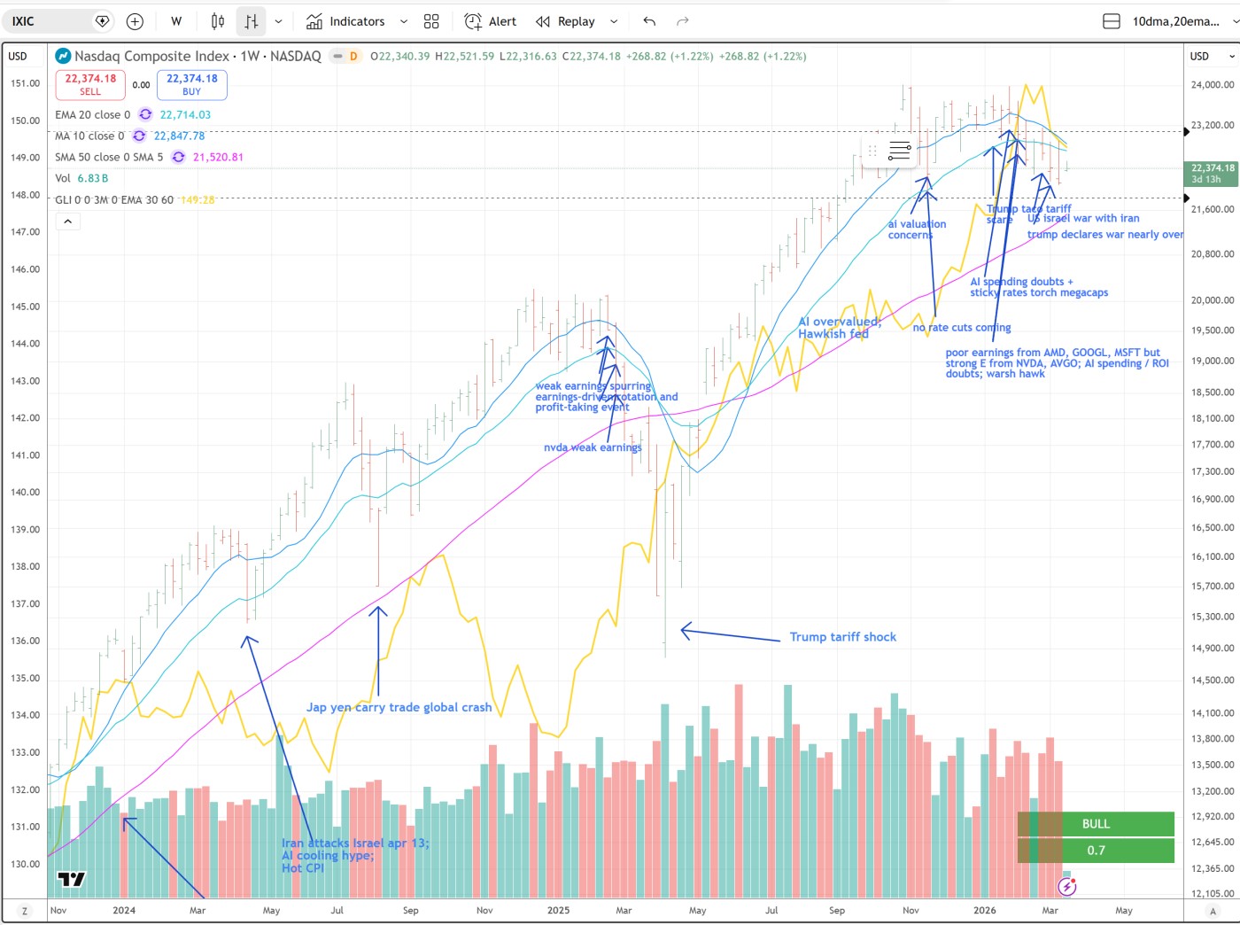 Jensen Huang, CEO of NVDA, also just buried doubts about AI spending peaking. He told 30,000 attendees NVDA sees at least $1 trillion in demand through 2027 for Blackwell and Vera Rubin, double the $500 billion he cited last year for those platforms through 2026. Demand exploded overnight. When the world's most valuable company signals that, betting against the AI buildout gets hard. He went further: "We are going to be short. Computing demand will be much higher than that." He dismissed bears claiming hyperscaler capex would fade. Vera Rubin ships second half this year, fueling agentic AI and massive inference. So while the Magnificent 7 lost over $2 trillion from peaks and sit 14% below records, they've tripled in three years and still hold $20 trillion in market cap combined. Nothing goes up in a straight line.