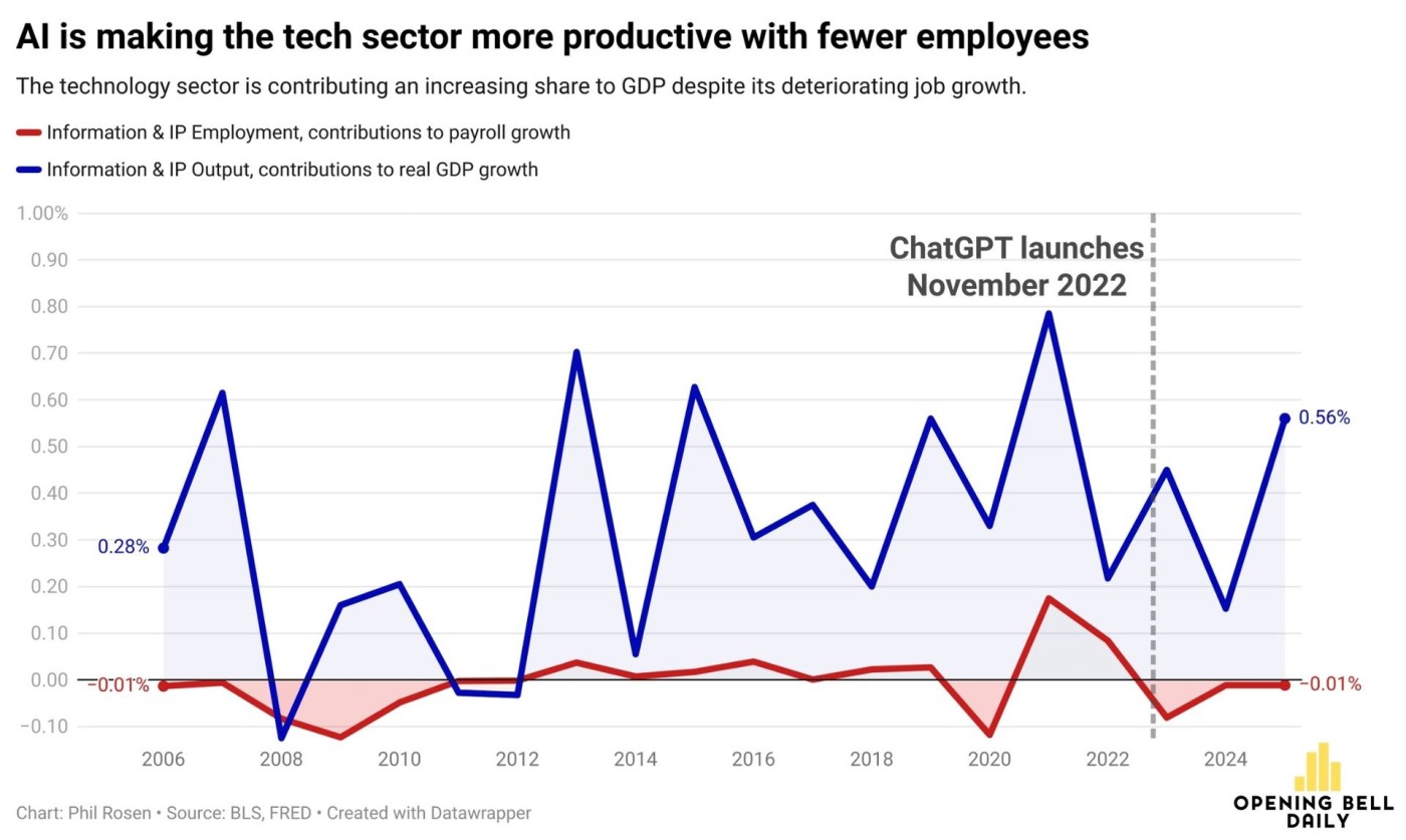 That said, AI-driven productivity has fundamentally transformed most industries, with artificial intelligence acting as a much larger disruptor than the dot-com boom of the 1990s. AI adoption is accelerating progress across sectors, sparking new infrastructure projects and creating a surge in energy demand far greater than the impact of traditional data trends. Artificial intelligence has been a massive deflationary force in the US economy. Companies are figuring out how to be more productive and profitable with fewer employees, thus spurring higher unemployment over the past two years contributing to higher youth unemployment. So each employee is producing more overall. Think of how your own levels of productivity have been boosted, depending on how well you utilize the myriad of AI tools at your disposal. Now streamline and optimize that in a corporate setting.