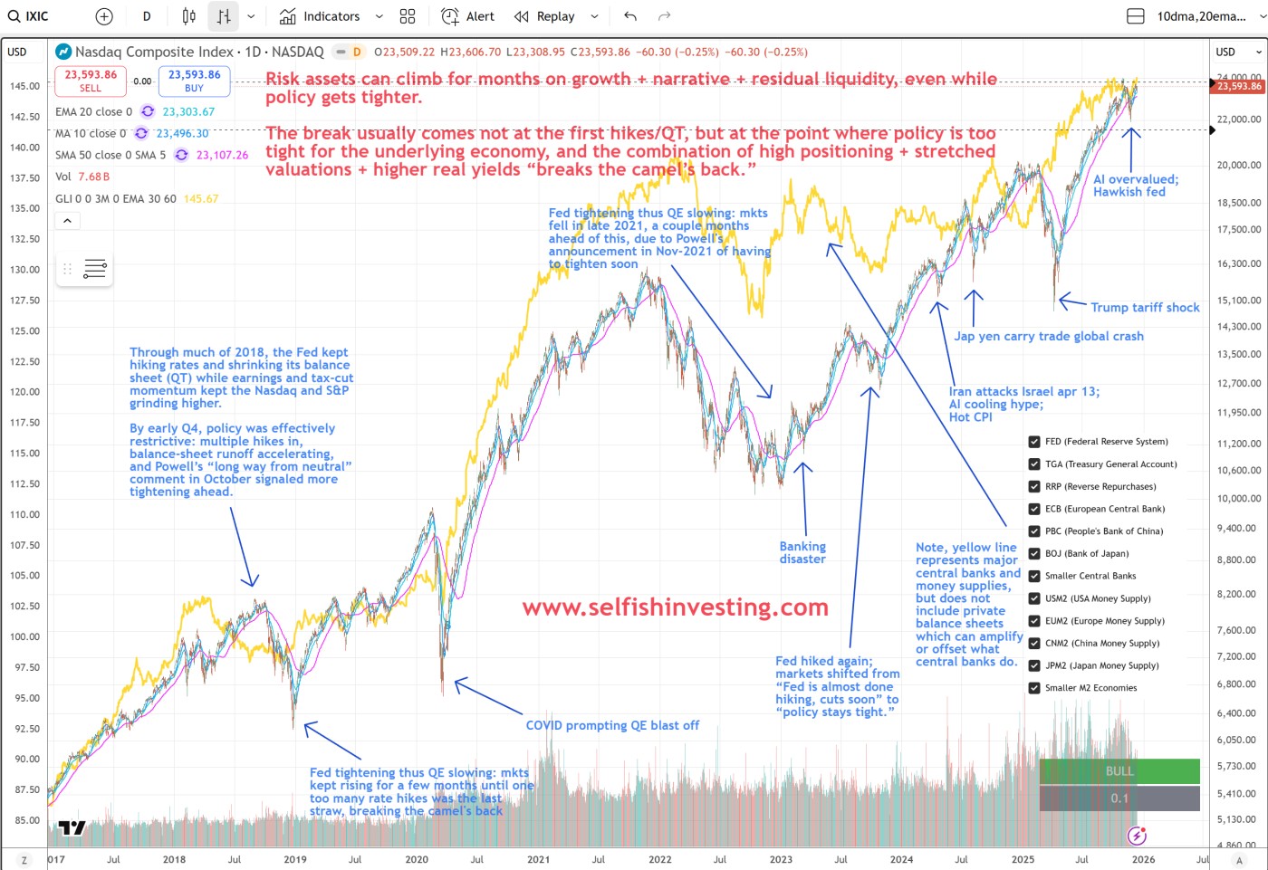 Even with accelerating liquidity, falling rates, strong earnings + GDP, AI productivity, and supply-driven deflation, equities can still get hit if one of a few big regimes breaks with comments in brackets:
