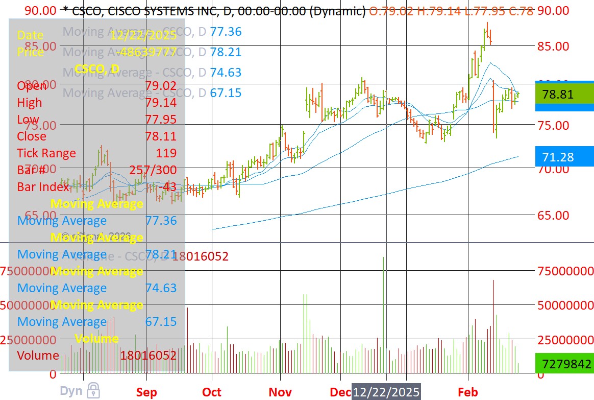CSCO could be shorted here or one could wait for it to break below its 50-dma. NVDA earnings could push CSCO and other tech stocks higher, so it may be prudent to wait for CSCO to roll over before shorting it.