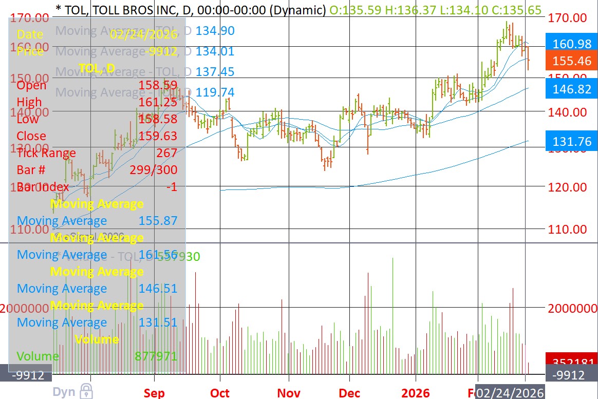 TOL, a housing stock, is shortable below its 20-dema. Homebuilder stocks fell sharply today after Lowe's and Home Depot issued cautious outlooks on the housing market, signaling limited spring improvement amid high rates and affordability woes.
