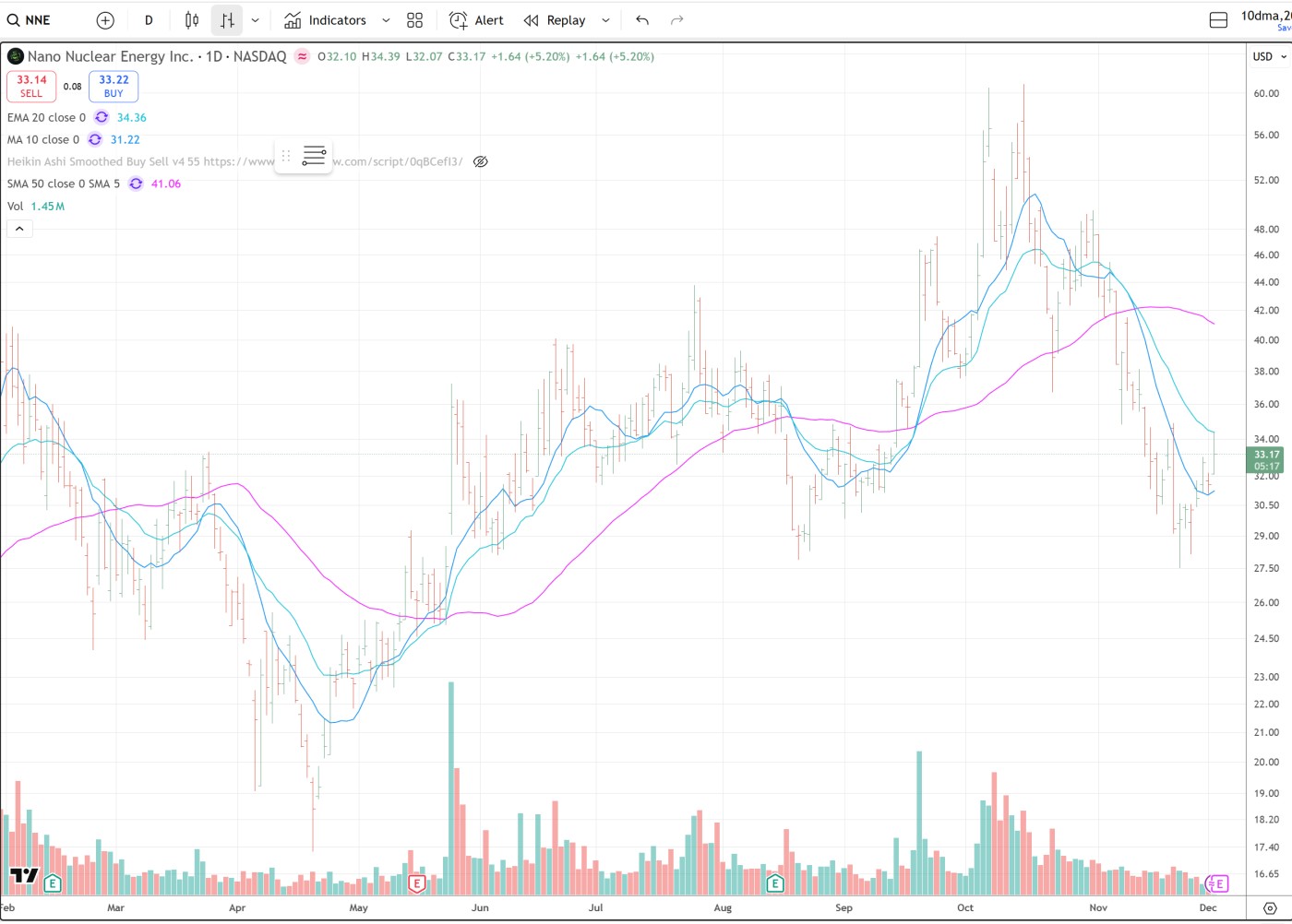NNE is up against its 20-dema. The uranium group suffered a steep correction and NNE is bouncing on weak volume.