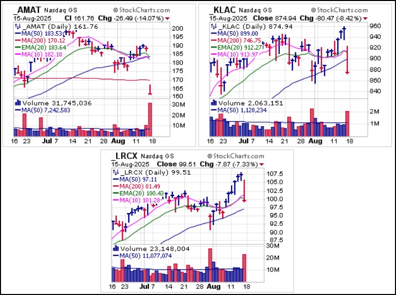 The calm surface of the major market indexes, however, masks some of the turmoil seen among individual stocks. Semiconductor equipment makers went down in flames on Friday after Applied Materials (AMAT) missed on earnings Thursday evening, sending the stock gapping through 200-dma support. AMAT's semi equipment cousins KLA Corp. (KLAC) and Lam Research (LRCX) sold off in sympathy with both triggering short-sale entries along prior left-side highs in double-top style and 10-dma/20-dema support.
