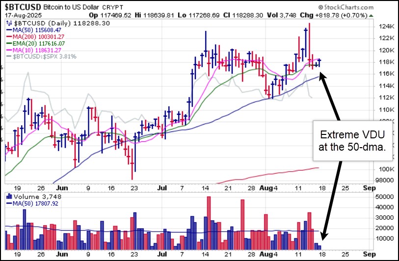 Bitcoin ($BTCUSD) reversed hard on Thursday as it briefly posted a new all-time high before getting slammed into 50-dma support on heavy selling volume. Since then, however, volume has diminished sharply and it is now showing VDU action at the 50-dma as selling volume dries up. This could serve as a potential long entry position using the 50-day as a tight selling guide.