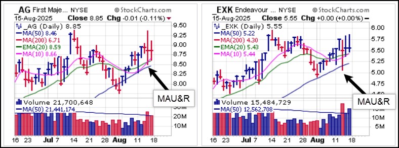 We have seen silver miners Coeur Mining (CDE), Hecla Mining (HL), and Pan-American Silver (PAAS) launch higher after reporting earnings the prior week, putting them in extended positions. First Majestic Silver (AG) reported earnings on Thursday morning and shook out hard at its 10-dma and 20-dema to post an MAU&R. AG reported earnings of 11 cents, handily beating the three-cent estimate, while missing slightly on revenue estimates which increased 94% over the same quarter a year ago. Endeavour Silver (EXK) reported earnings on Wednesday morning with a three-cent loss vs. estimates of a one-cent profit but revenue came in at $85.3 million, surpassing the consensus estimate of $81.48 million by 6.67% and increasing by 46% vs. the same quarter a year ago. Like AG, the stock posted a deep MAU&R at the 50-dma before rallying to regain 10-dma/20-dema support where it remains potentially buyable using the two moving averages as selling guides. If silver prices continue to rally, it is likely that these stocks will eventually follow the group higher.