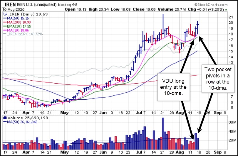 We discussed crypto-miner turned Data Center infrastructure provider IREN Ltd. (IREN) as a name to watch as it held tight just above the 10-dma. On August 7th, the company announced it was shifting its focus towards data center infrastructure services, likely accounting for why it has held up better than other crypto mining stocks. On Thursday, IREN came in to test 10-dma support and rallied on volume to post a pocket pivot and then repeated the trick the next day. This becomes actionable as close to the 10-dma as possible using the line as a tight selling guide.