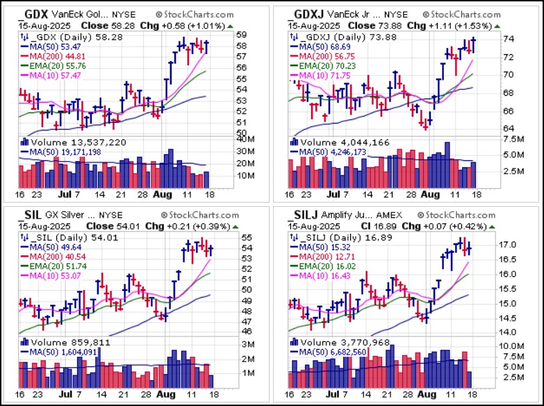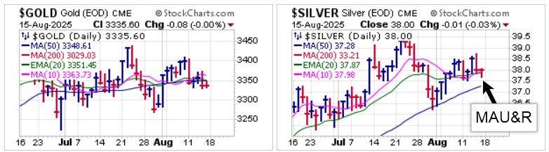 Gold and silver continue to consolidate with gold now working its way through a 17-week base with tight weekly closes over the past several weeks. Silver posted an MAU&R long entry at the 10-dma and 20-dema on Friday which can be implemented using any silver ETF, such as the iShares Silver Trust (SLV) or the Sprott Physical Silver Trust (PSLV), for example.