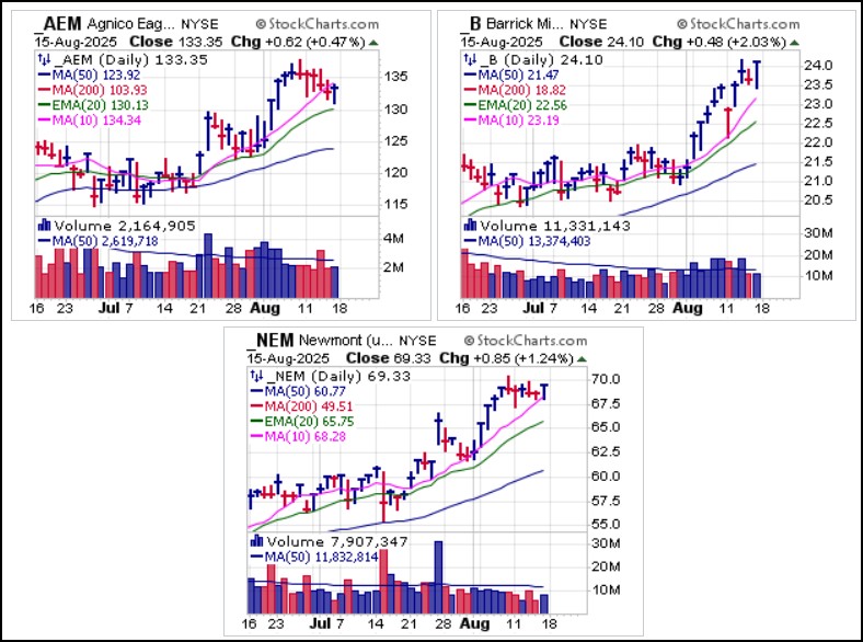 Big-stock institutional favorites among the gold miners have been buyable on low-volume pullbacks to support. Here we see Agnico-Eagle Mines (AEM) pulling into 20-dema support and rallying off the intraday lows on Friday as volume declined, while Barrick Mining (B) continues to press to 52-week highs after reporting earnings last week. Newmont Corp. (NEM) posted a VDU pullback to the 10-dma on Thursday and then shook out at the line where it was in a VDU long entry position using the 10-dma as a selling guide. All three names remain well above recent breakout levels.
