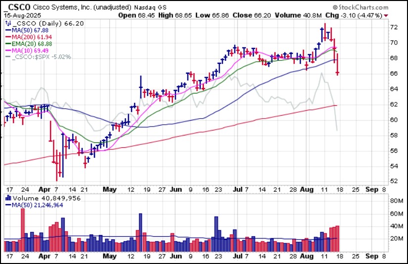 Big-stock telecom Cisco Systems (CSCO) reported earnings Wednesday after the close and broke down on Thursday, triggering short entries at the 10-dma and 20-dema before bouncing off the 50-dma on an intraday basis. On Friday it presented an optimal short entry as it broke back below the 20-dema and then slashed through 50-dma support on heavy selling. Rallies into the 50-dma would present short-sale entry opportunities from here so can be watched for.