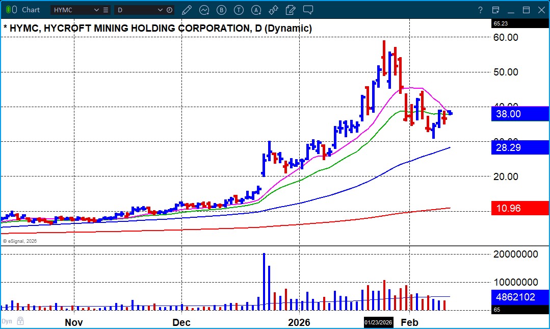 Hycroft Mining (HYMC) as a long entry at 33.32. The stock is now trading at 38.15, a gain of 15% as it clears 20-dema resistance. This has now shifted into an MAU&R at the 20-dema which can be used as an add point or an entry using the 20-day line as a trailing stop or a tight selling guide for initiated positions.