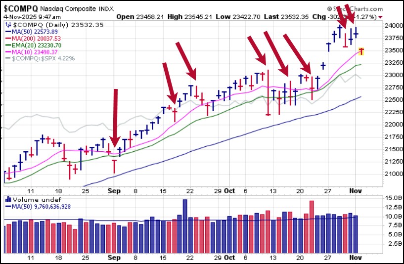 Bill O'Neil used to tell me that when big money is distributing stock along what eventually becomes a market top, they try to condition buyers to come in on every pullback off the peak. Over the past few days we have seen consistent gap-up moves or early rallies that get sold into, taking the indexes back towards the UNCH line or just below, sometimes even a little more than that, but just enough to make things look bearish.