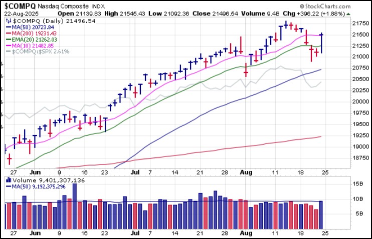 Slumping major market indexes recovered on Friday following dovish comments from Fed Chairman Jay Powell during his speech at the Fed's Jackson Hole Symposium. The rally took the NASDAQ 0.1% back above the 10-dma but still down for the week. The