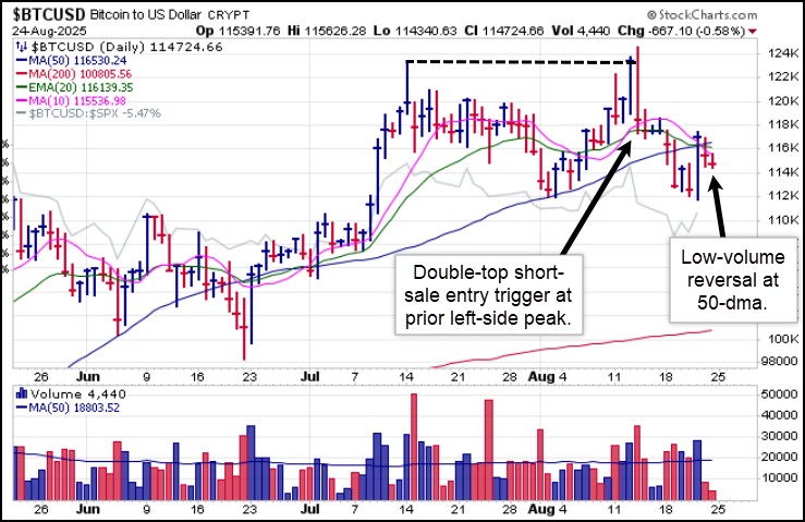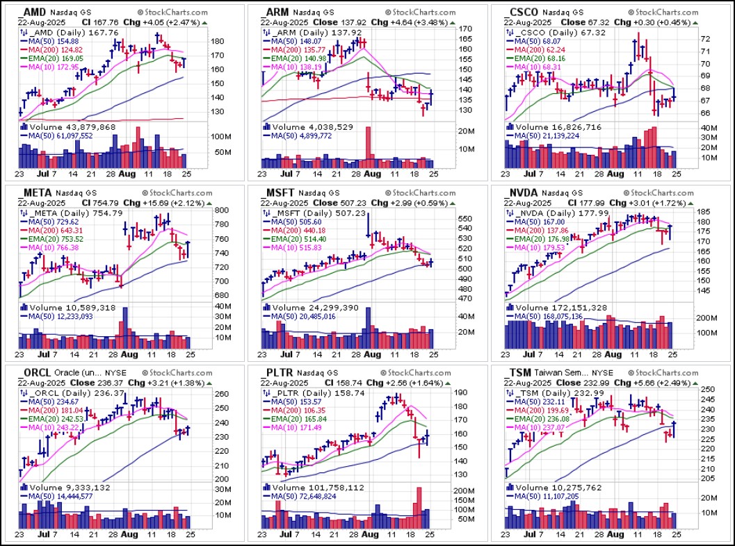 Meanwhile, big-stock AI-related techs, which have been beaten-down for several days, mostly staged oversold reaction rallies on Friday in reaction to Powell's speech. Many of these moves were relatively tepid within the context of these stocks' oversold condition coming into Friday. With many of these stocks down deep in their patterns, some have undercut moving averages in MAU&R style so could continue higher as the new trading week begins in potentially normal reaction bounces. Others, such as telecom leader