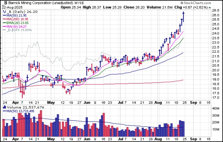 Barrick Mining (B), for example, has been up 13 out of 16 days in a row and well extended on the upside since breaking out three weeks ago.