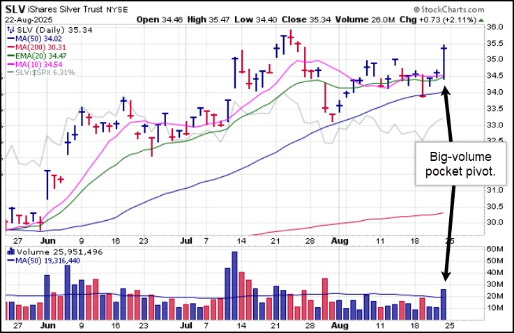 iShares Silver Trust (SLV) posted a strong-volume pocket pivot on Friday off 20-dema support. The move occurred very quickly as Powell began to speak and is extended at this point.