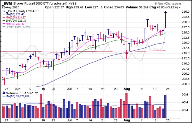 iShares Russell 2000 (IWM) ETF to lead all indexes as regional financials and other small-cap names exhibited a tidal wave of upside movement in response to a Fed that is now more open to interest rate cuts based on the realization as expressed by Powell on Friday that unemployment is slowing faster than expected.