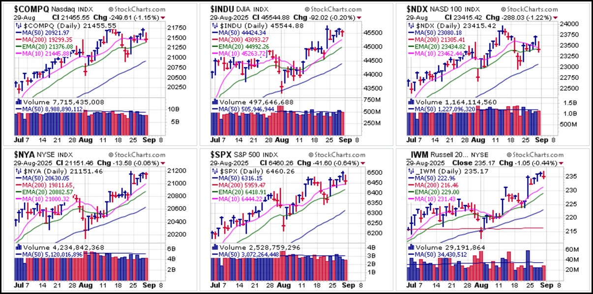 Major market indexes sold off across the board, with the NASDAQ 100 Index taking the brunt of the selling as AI-related names were hit, closing below 20-dema support . closing below moving average support. The NYSE Composite was the best-performing indexes on Friday as it held tight, down only -0.06% on the day. Volume was roughly flat on both exchanges.