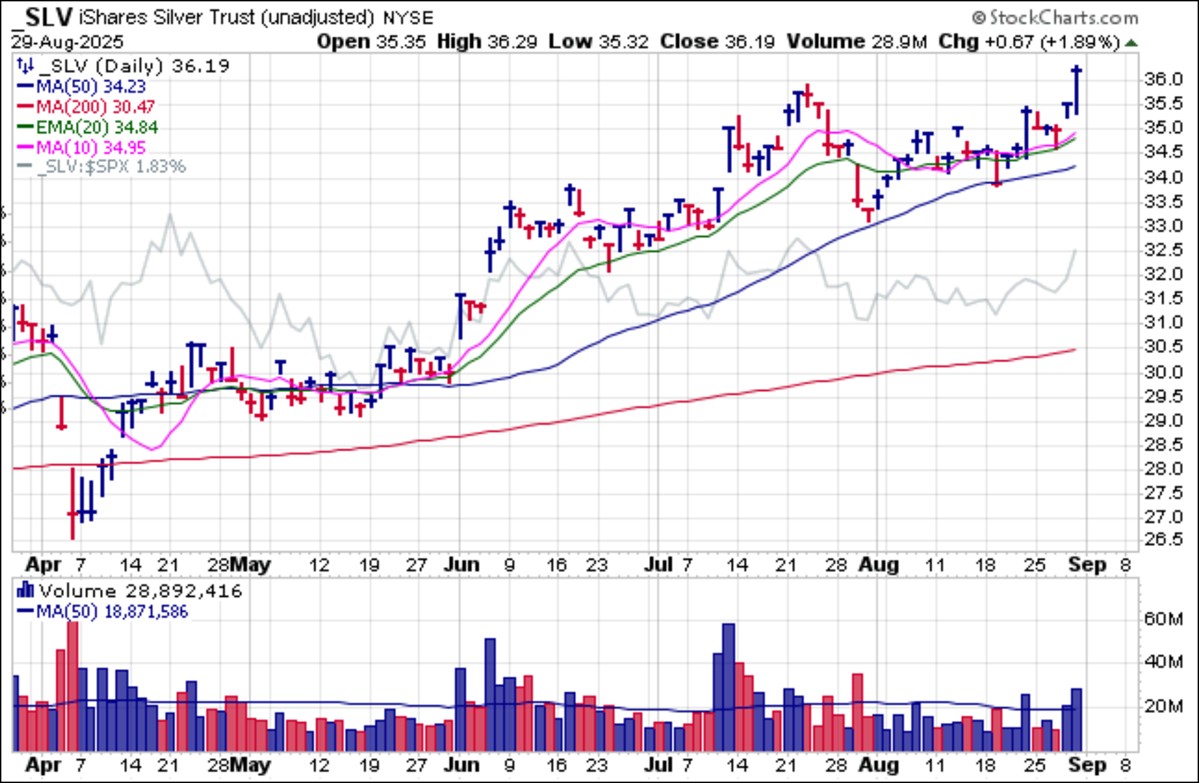 iShares Silver Trust (SLV) traded strong volume on Friday's breakout and remains within buying range, although we have previously discussed this as a long entry lower in the pattern.