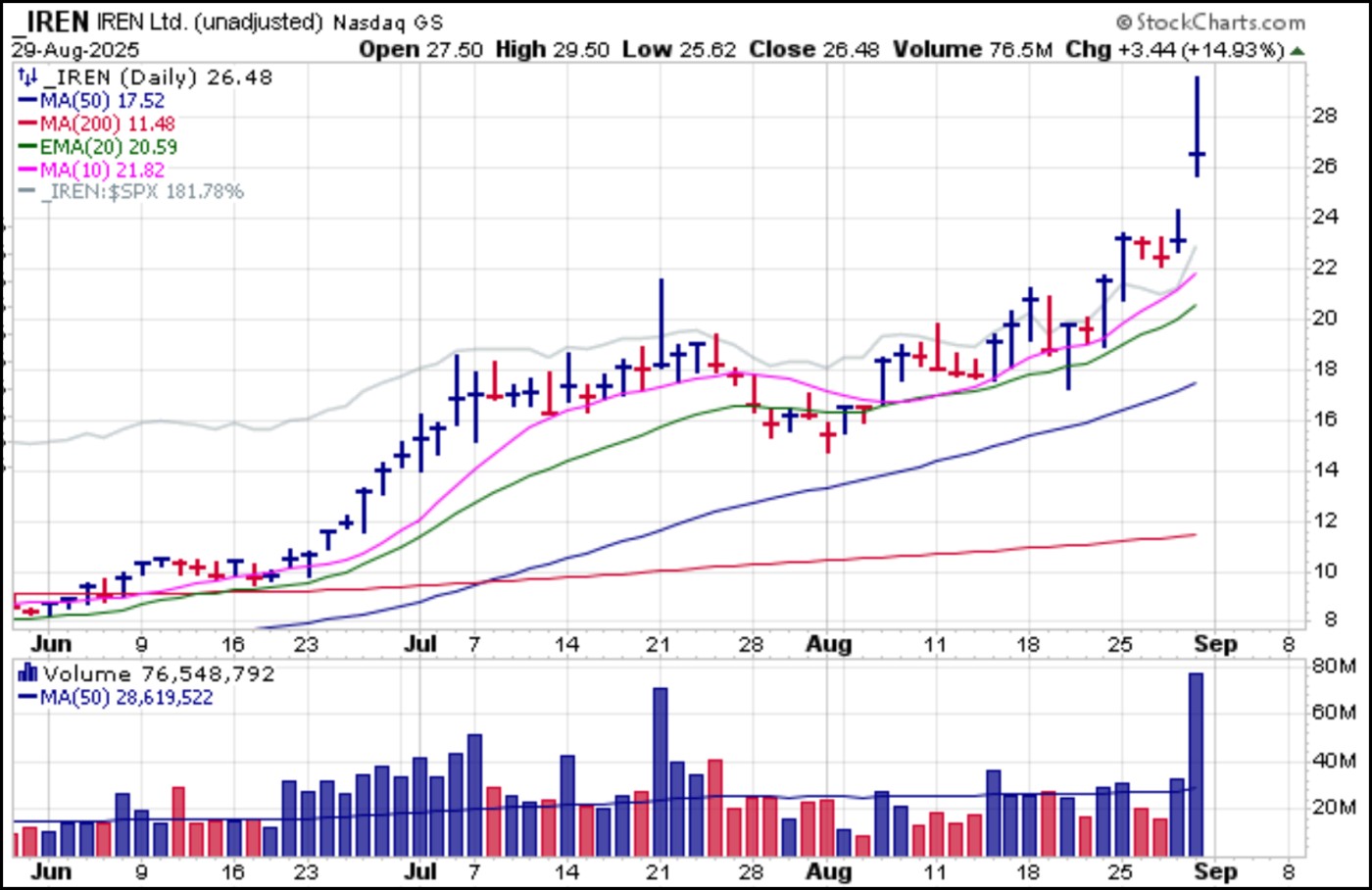 IREN Ltd. (IREN), which we have previously discussed, was one bright spot in the AI space on Friday. The company reported earnings on Thursday after the close and blew out 20-cent earnings estimates by coming in with earnings of 70-cents on a sizable 255% increase in sales growth. That led to a buyable gap-up move that stalled sharply off the highs but which remains in force using the 25.62 intraday low, 3.24% below Friday's 26.48 close, as a selling guide.