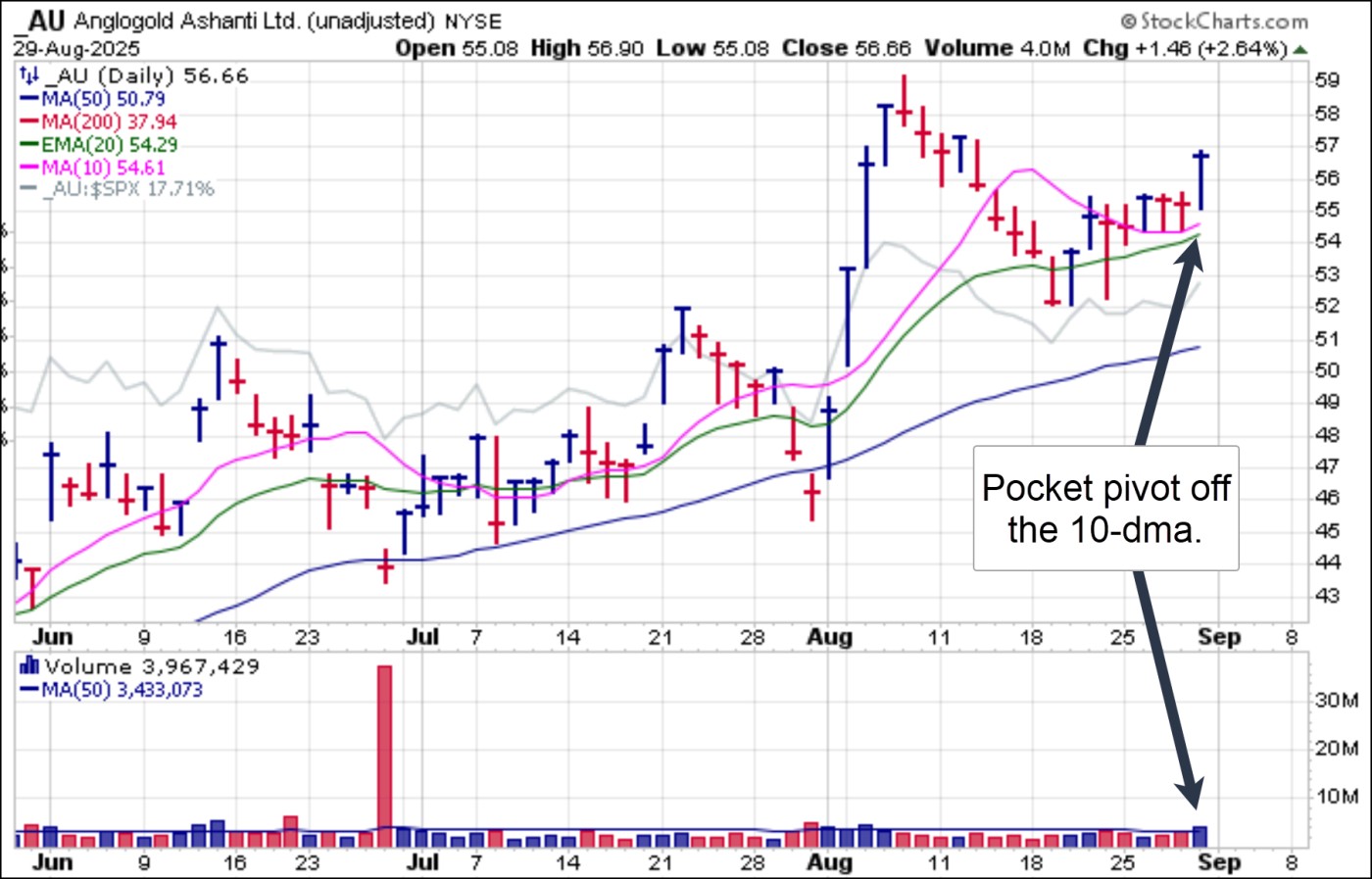 AngloGold-Ashanti (AU) is showing a real-time long entry set-up, a pocket pivot off the 10-dma on Friday. It closed Friday 3.8% above the 10-dma, so any pullbacks of 1% or more, closer to the 10-dma, might offer better entries from here, if you can get them.