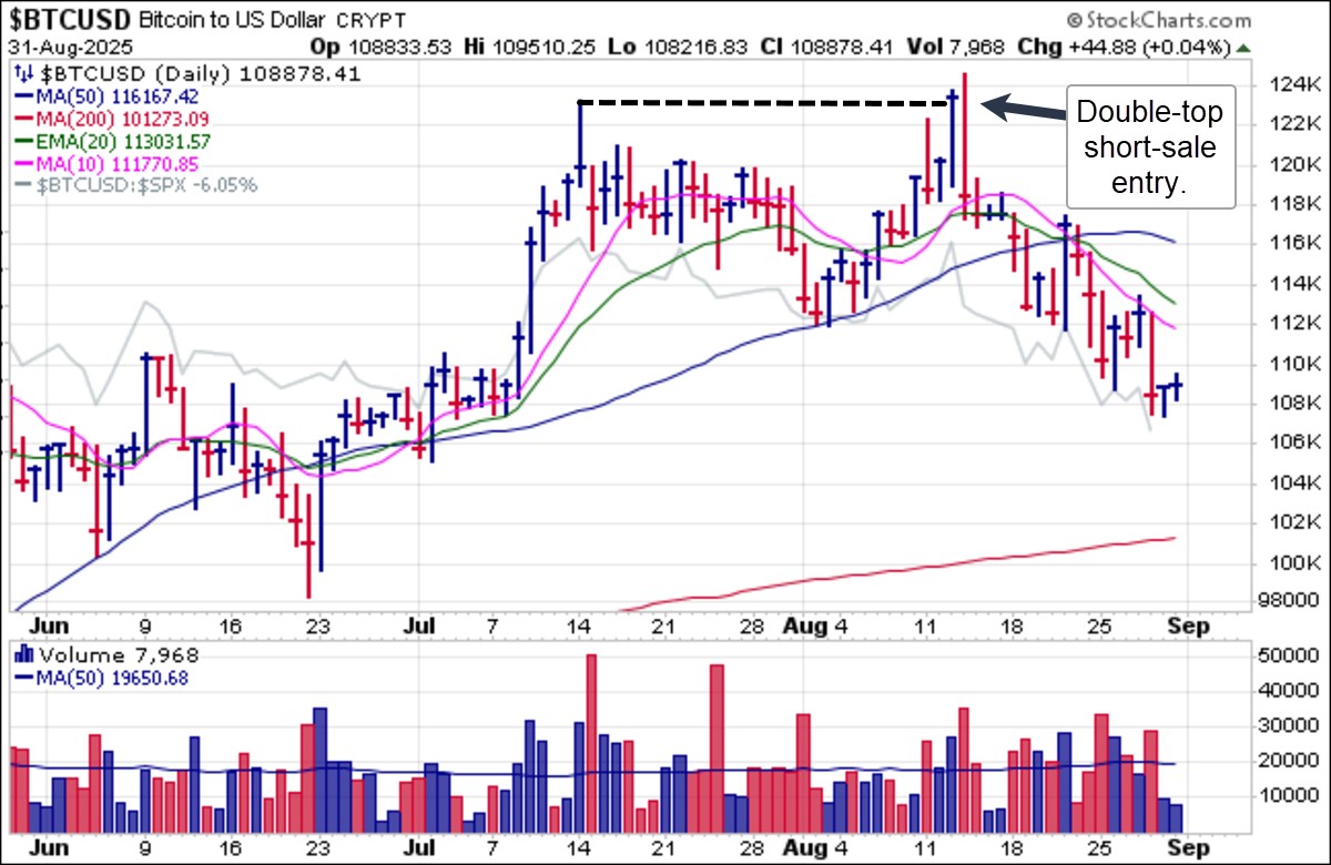 Bitcoin ($BTCUSD) is once again acting like an AI tech stock as it continues to trend lower since posting a double-top short-sale (DTSS) entry trigger in mid-August on a failed breakout attempt to new highs. $BTCUSD was hammered on Friday and as of Sunday evening is showing a small rebound over the Labor Day Weekend, so far.