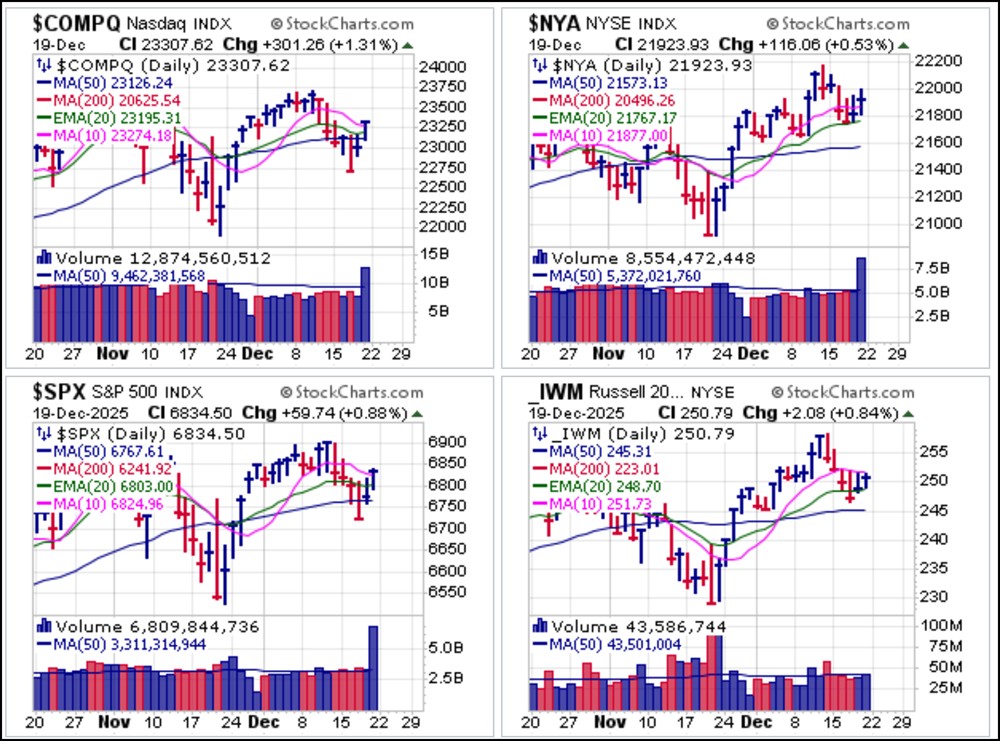 Russell 2000 regained 20-dema support. For now, the indexes remain in more or less neutral chart positions as we head into the short Christmas and then New Year's Holiday trading weeks.