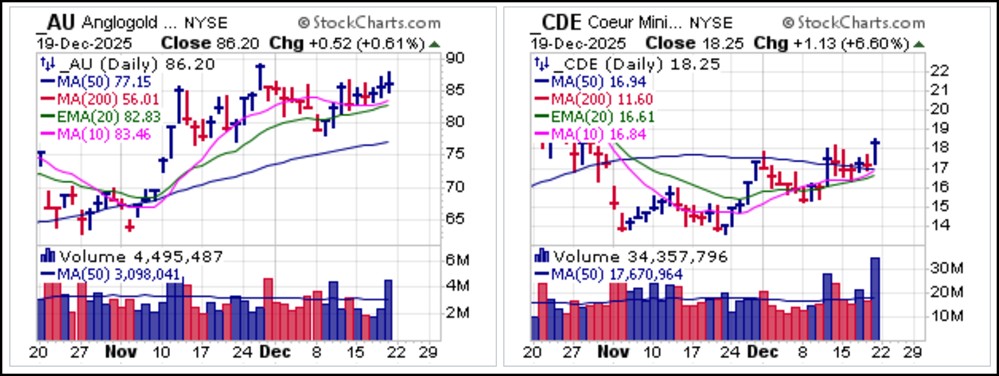 Coeur Mining (CDE) as they posted VDU action along moving average support. Both stocks then moved higher from there as CDE also posted a big-volume pocket pivot off the 50-day line on Friday.