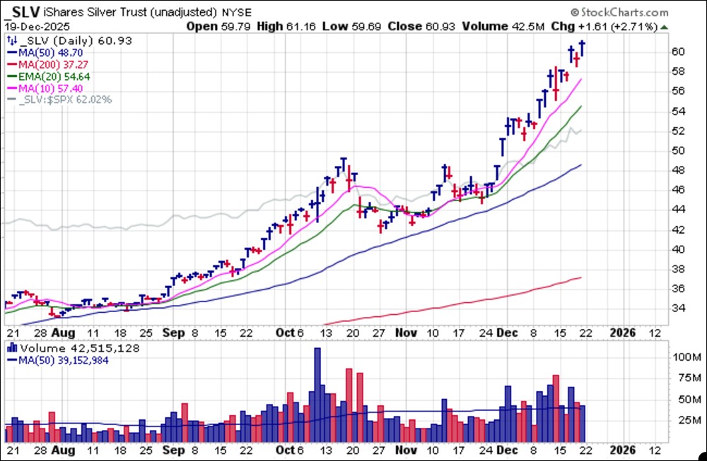 iShares Silver Trust (SLV) all posted all-time highs at $67.395, $67.21 and $60.93, respectively, on Friday as the white metal's steep uptrend that began in late November continues with no let up in sight just yet.