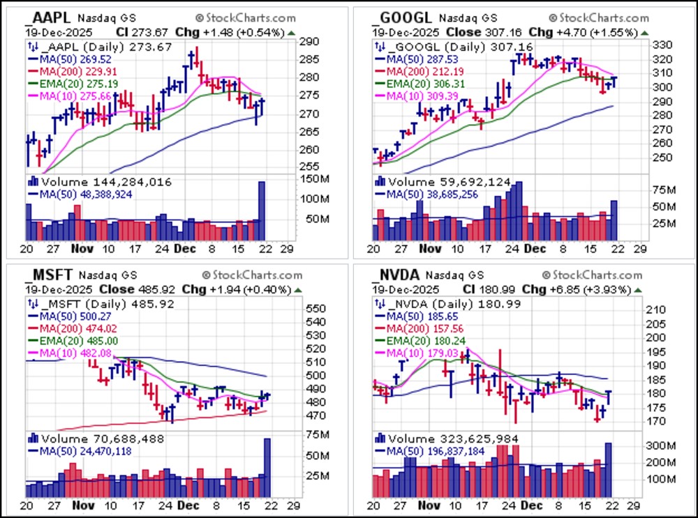A week long sell-off in the major market indexes ended on an up note on Friday's record $7 trillion year-end options expiration. This produced a number of pocket pivot moves in big-stock techs, such as Apple (AAPL), Alphabet (GOOGL), Microsoft (MSFT) and Nvidia (NVDA).Whether these are one-off volume distortions due to a record OpEx day or the start of a potential Santa Claus Rally will be clarified once the new trading week begins on Monday.