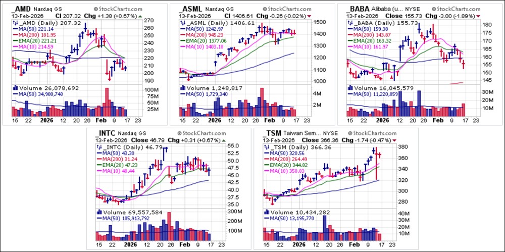 Most big-stock technology and related names that we reported on in early January and which had decent run-ups into late January have since gone into consolidation mode or rolled over outright. ASML Holdings (ASML) is holding along 10-dma support but should be watched closely for any faliures at the 20-dema. Taiwan Semiconductor (TSM) looks like the victim of bad price data on Thursday as our intraday charts for that day show a low of 364.39 so has been able to hold 20-dema support after breaking out on earnings last week. Advanced Micro Devices (AMD) blew up after earnings and has been a short entry at 50-dma resistance this past week. Alibaba (BABA), which is an e-commerce and AI tech play these days, failed quickly on a buyable gap-up move in late January and has more recently been a short entry at 20-dema and then 50-dma support. Finally, Intel (INTC) also blew up after earnings in the latter part of January after a sharp run-up to start off the New Year. It is now wavering at 20-dema support where it may be in a short-sale entry position using the 20-dema as a tight covering guide.