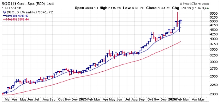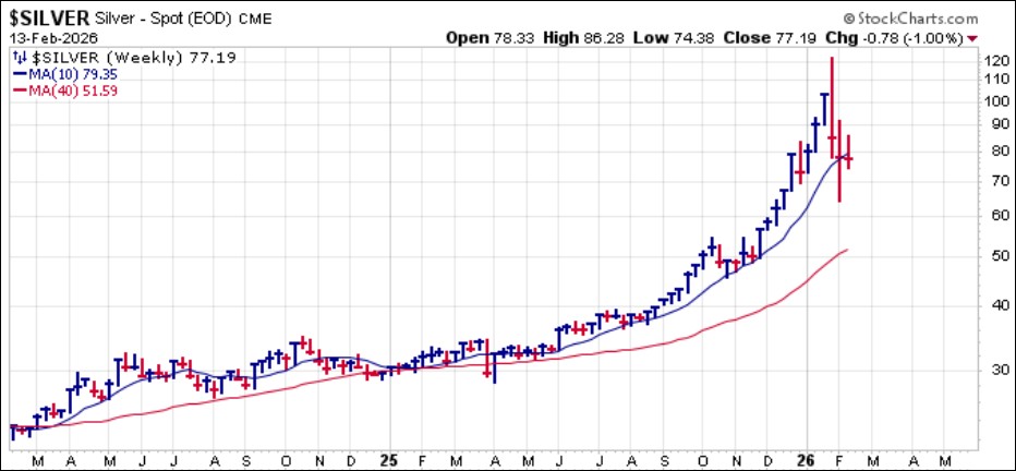 Interestingly, while silver has been extremely volatile but remains about 10% higher for the year so far, Spot Gold posted a new all-time high weekly close this past week. Note the massive shakeout at 10-week moving average support last week. Thus, based on the weekly chart, the uptrend in gold remains intact.