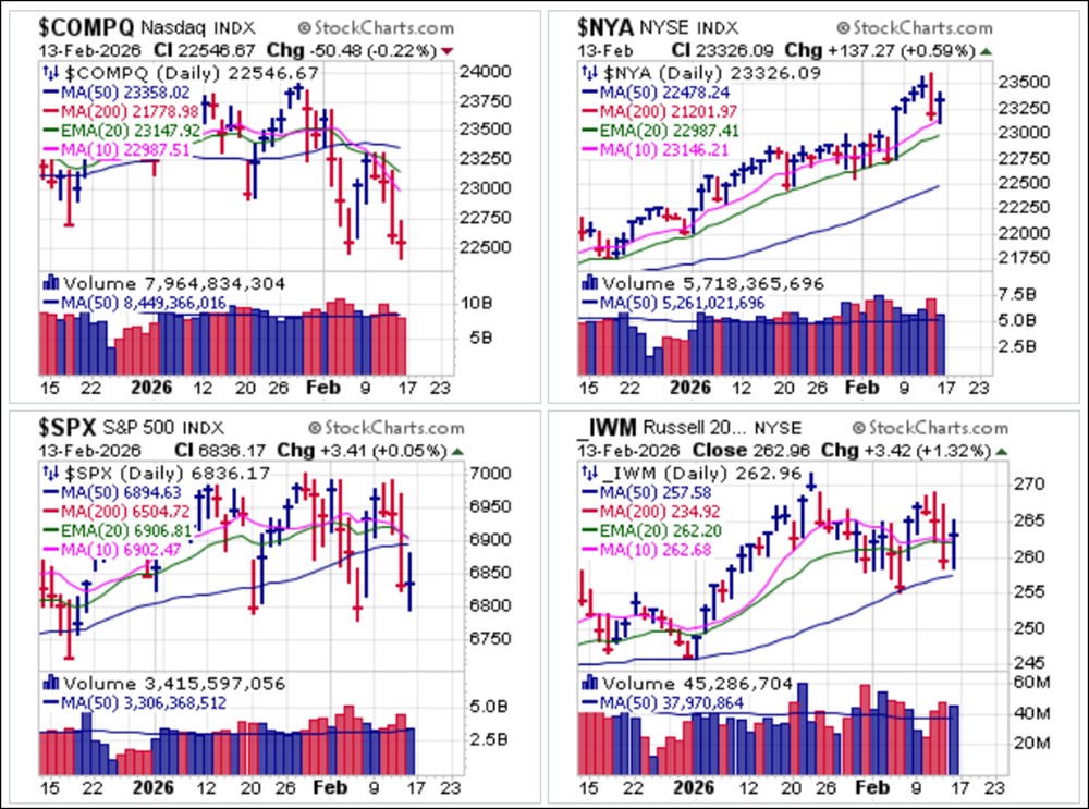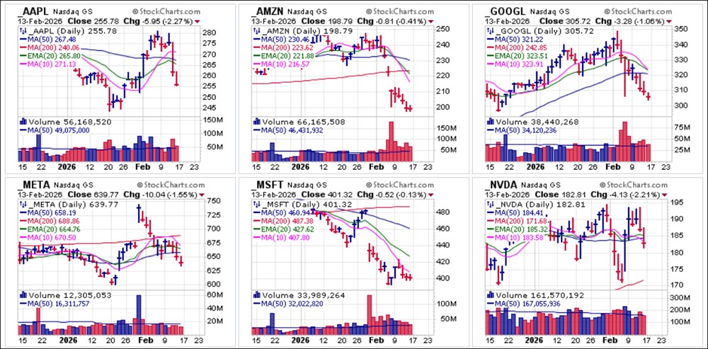 The action in these names attest to the changing character of the market, where scant few big-stock techs attempt to hold up while the rest of tech has sold off. This is underscored by the action in big-stock NASDAQ index names shown below. The past week has seen Apple (AAPL), Amazon.com (AMZN), Alphabet (GOOGL), Meta Platforms (META) and Microsoft (MSFT) have come apart over the past few days and weeks. Nvidia (NVDA) which is expected to report earnings on February 25th, busted 50-dma support on Friday to trigger a potential short entry at the line.