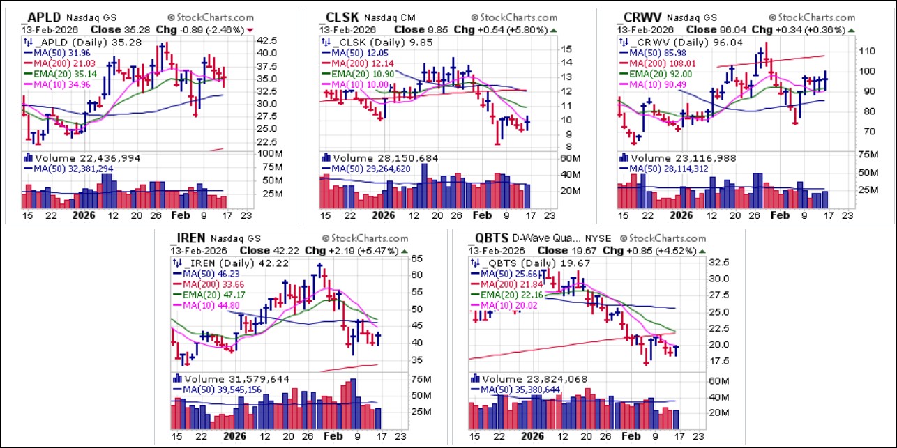 Most of the higher-beta and in some cases former FOMO leaders of 2025 that were reported on in early January on the long side had decent upside moves in January as well. However, as January came to a close these names have all corrected sharply off their January highs. Applied Digital (APLD) had a phenomenal move since posting pocket pivots along its 50-dma in early January but failed on a breakout attempt in late January. It is now wavering along 10-dma and 20-dema support. CleanSpark (CLSK) was reported on in mid-January as it posted pocket pivots along the 50-dma but never went anywhere and broke below 200-dma support in very bearish fashion at end of January. It has since made lower lows. CoreWeave (CRWV) failed at 200-dma resistance nearly three weeks ago and is now hanging along 10-dma/20-dema support. The stock in reality remains within a long, wide-ranging bear flag that formed following a massive price decline from the 187.00 June 2025 peak. IREN Ltd. (IREN) also had a strong move in January but topped near the end of the month has has since sliced sharply lower since and is now living below its 50-dma. D-Wave Quantum (QBTS) also failed in the latter part of January and has since blown up as it now lives below the 200-dma.