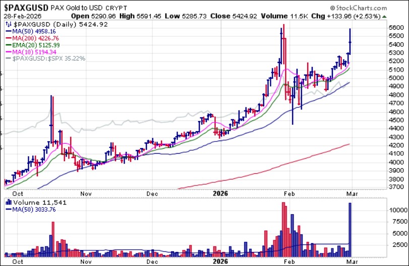 Orange Swan which has injected a great deal of uncertainty into the market as we head into the new trading month in March. For now it appears that long precious metals and short tech has been the optimal configuration, and this looks to be the case so far this weekend amid the latest attacks on Iran. Tokenized gold via