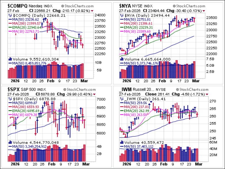 S&P 500 remain below 50-dma resistance with the S&P breaking back below the line on Friday on heavy month-end volume. Things will certainly not improve on Monday when trading resumes based on overnight news Friday that the U.S. and Israel had begun a major military action against Iran. Stock futures are gapping lower but precious metals futures are gapping higher at the time of this writing.