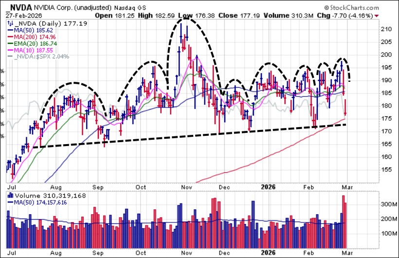 Nvidia (NVDA) reported earnings on Wednesday after the close and promptly broke down after rallying back above the $200 Century Mark in the after-hours on Wednesday in an initially bullish reaction to earnings. That did not last long as NVDA quickly dropped back below the $200 level and opened up on Thursday morning at 194.27, rallied about 1% and then turned tail as it busted 10-dma, 20-dema, and 50-dma support. On Friday the stock continued lower and now appears to be setting up for a test of 200-dma support and the neckline of a