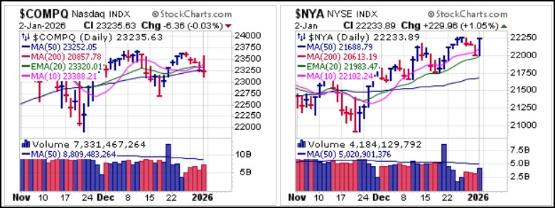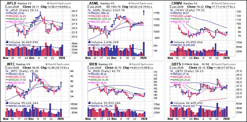 Overnight on Friday big news hit the wires as the U.S. launched a successful military attack on Venezuela, resulting in the arrest of Venezuelan President Nicolas Maduro and his wife who were then whisked away to New York to face trial on drug trafficking and other charges. This may impact markets on Sunday evening when futures open for trading as well as on Monday morning when the first full trading week of the New Year begins.ASML Holdings (ASML) led semiconductors higher on Friday with a big-volume buyable gap-up using the intraday low at 1133.48 as a selling guide. We reported on that as well as bottom-fishing pocket pivots (BFPPs) in CoreWeave (CRWV), Intel (INTC), Iren Ltd. (IREN) and D-Wave Quantum (QBTS). CRWV failed to hold its early pocket pivot, however, as volume levels fell into the close.