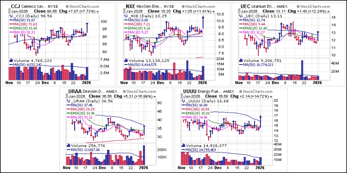 We also reported on pocket pivots in a number of uranium names, including the Direxion Daily Uranium Bull 2X (URAA), on Friday but one had to enter these trades early in the day as they all closed quite extended to the upside. Uranium Energy Corp. (UEC) also failed to trade enough volume for a pocket pivot by the end of the day. Constructive pullbacks from Friday's closing levels would provide potentially lower-risk entries but for now these remain well-extended to the upside such that entries at these levels carry additional risk if they fail.