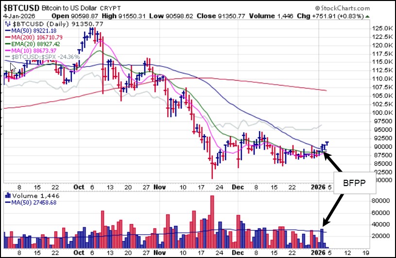 As gold and silver pause and attempt to consolidate recent sharp gains, Bitcoin ($BTCUSD) is attempting to get up off its back by posting a bottom-fishing pocket pivot (BFPP) at the 50-dma last Wednesday. Technically this becomes actionable using the 50-dma as a tight selling guide.