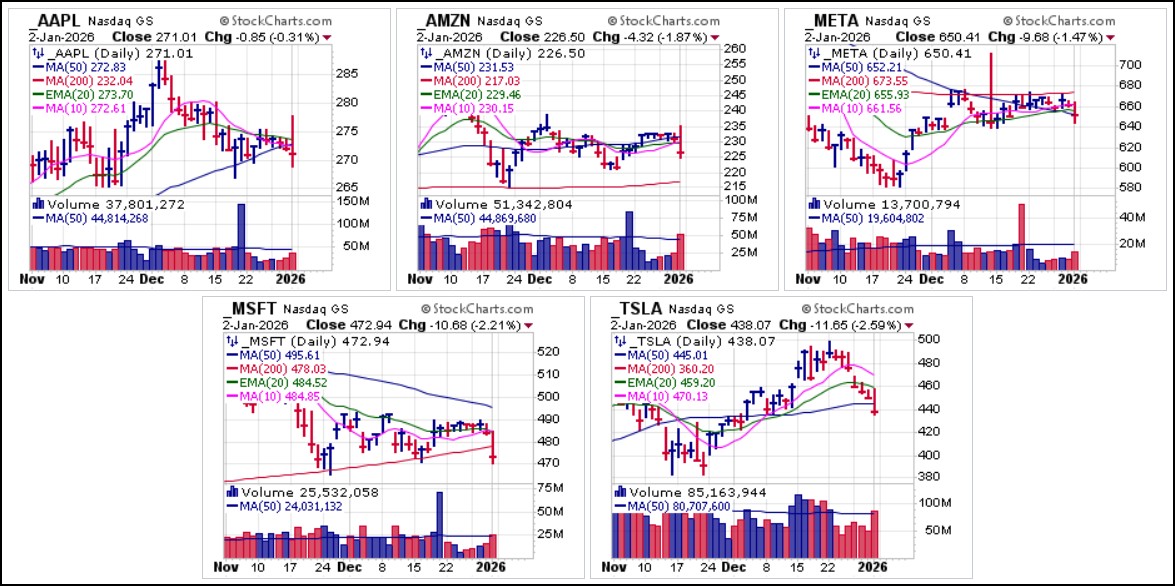 Friday's action was quite peculiar in that while a number of beaten-down FOMO areas of the market were rallying and semiconductors including ASML Holdings (ASML), Micron Technology (MU) and SanDisk (SNDK) were mostly rallying, big-stock NASDAQ names faltered badly.Apple (AAPL) and Amazon.com (AMZN) posted very wide outside reversals as they reversed sharply at 10-dma, 20-dema, and 50-dma support. Meta Platforms (META) triggered short entries at its 10-dma, 20-dema and 50-dma today while Microsoft (MSFT) rolled below 10-dma support before slashing through and closing below its 200-dma. Tesla (TSLA), which had triggered short-sale entries at the 20-dema earlier in the week triggered another one Friday as it busted 50-dma support on news of weak sales.