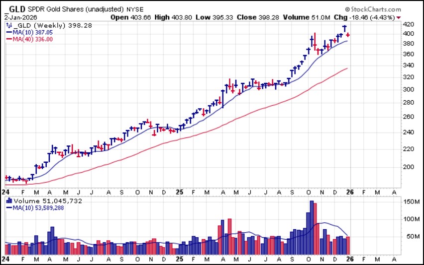 Gold rallied with silver last week, resulting in a low-volume breakout in the SPDR Gold Trust (GLD). After the CME changed its rules gold pulled back with the rest of the precious metals but for now remains well above 10-week moving average support which serves as near-term support.